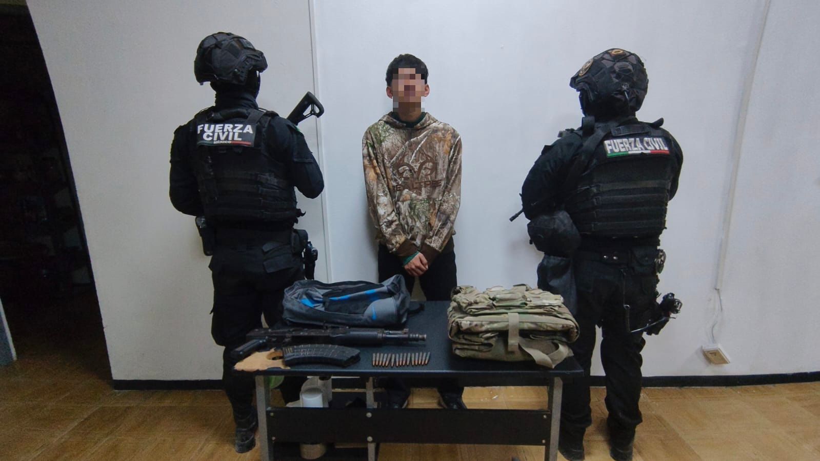 Noticom.com.mx.- Elementos de Fuerza Civil detuvieron a un joven cuando realizaban trabajos de detección y disuasión delictiva, y le detectaron un arma y equipo táctico; en la Carretera a Sandia en Aramberri.